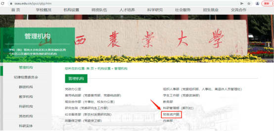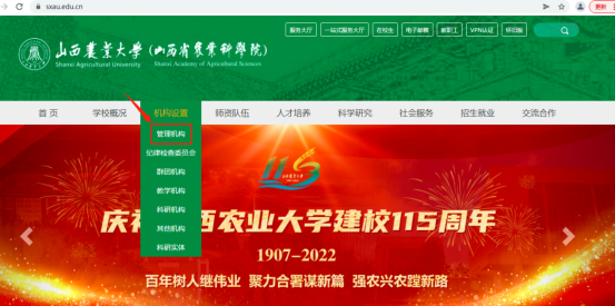 Ⅰ、请访问“山西农业大学”官方网站,在网站标题栏中点击“机构设置”,再点击“管理机构”