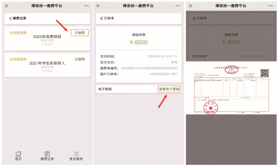 Ⅲ、也可通过"山西农大财务资产部"公众号,点击“学生缴费”-“应收款缴费”-查看“缴费记录”→点击具体某收费项目“已缴费”-“查看电子票据”进行查看
