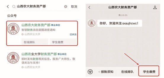 Ⅰ、微信搜索“山西农大财务资产部”,关注公众号→点击“学生缴费”进行登录