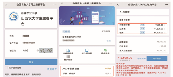 Ⅵ、手机上会展示需缴费项目及金额等信息(学费、住宿费、代收教材费、公寓物品费...),参考“(公众号)缴费Ⅲ—Ⅵ步骤”完成缴费操作