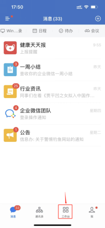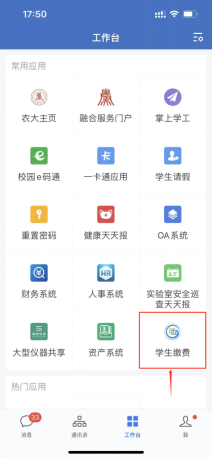Ⅰ、登录“山西农业大学”企业微信,点击“工作台”,再点击“学生缴费”