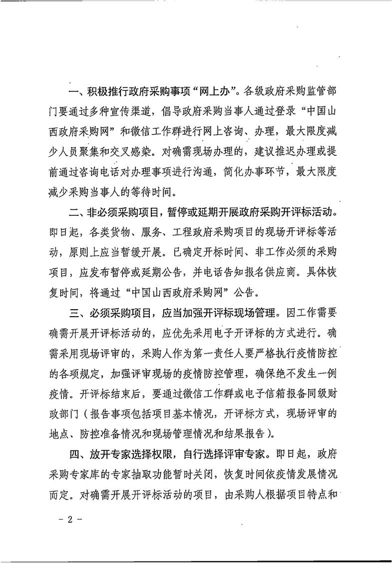 山西省财政厅关于新型冠状病毒感染的肺炎疫情流行期间开展政府采购现场开评标活动有关事项的通知(晋财购〔2020〕4号)
