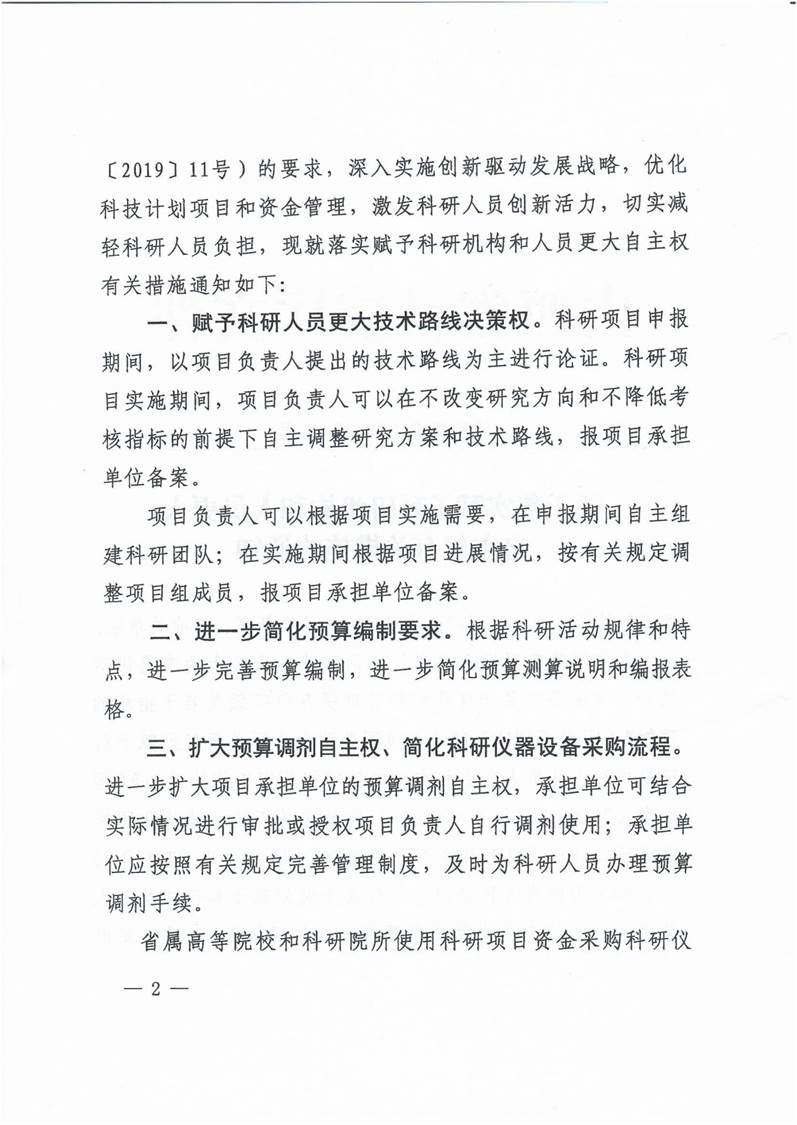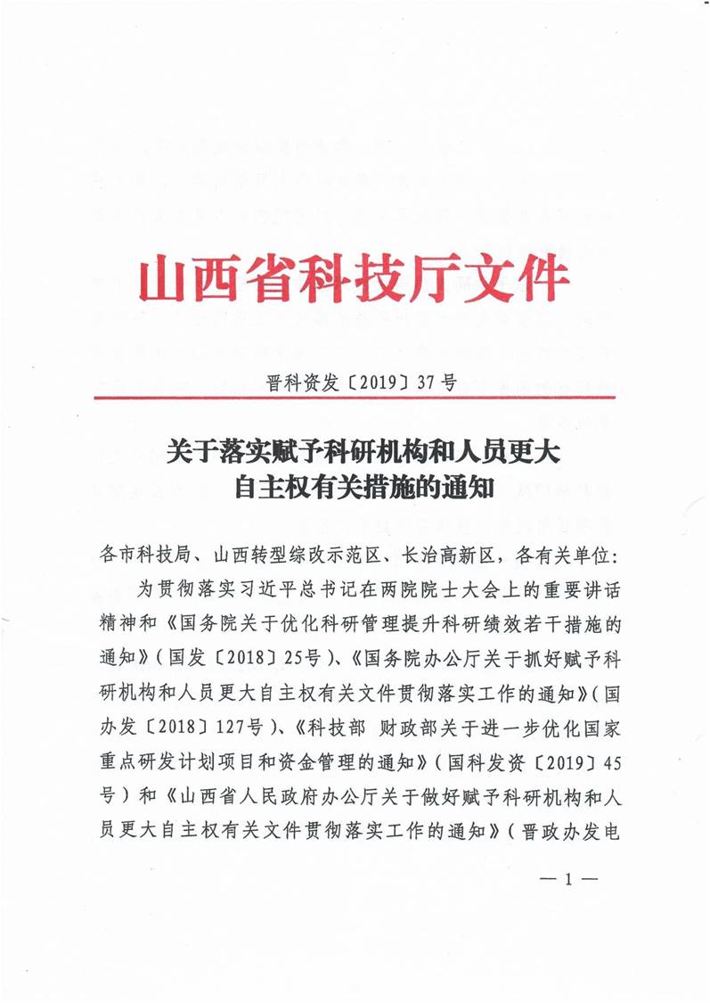 关于落实赋予科研机构和人员更大自主权有关措施的通知(晋科资发〔2019〕37号)
