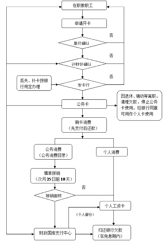 第六条我校在职在编工作人员原则上实行一人一卡。公务卡申领程序为:申请人本人如实填写公务卡申请表,经所在单位、部门审核后,连同本人身份证复印件及其他相关证明文件送计财处,经计财处对申请人资料进行确认,送交发卡行,发卡行按规定程序发卡。公务卡申办成功后,经计财处确认核实,由发卡行将持卡人姓名和卡号等信息传输到省级国库集中支付系统。